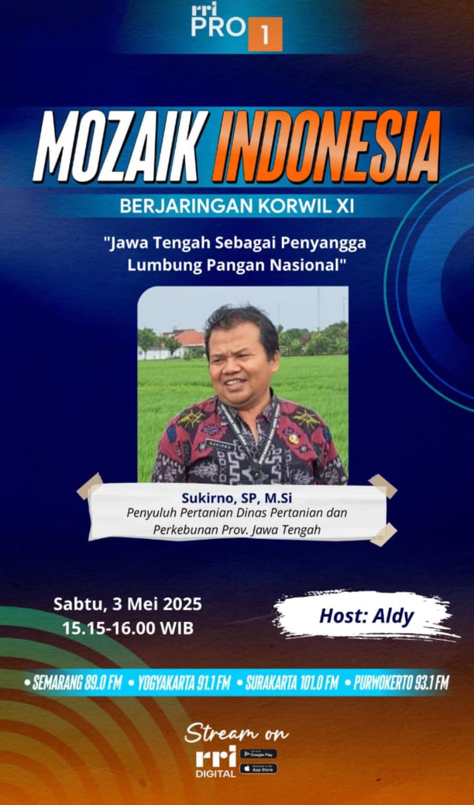 | 2025 | RRI PRO 1 - Mozaik Indonesia - Sukirno, S.P., M. Si. : Jawa Tengah sebagai Penyangga Lumbung Pangan Nasional | Klik! |